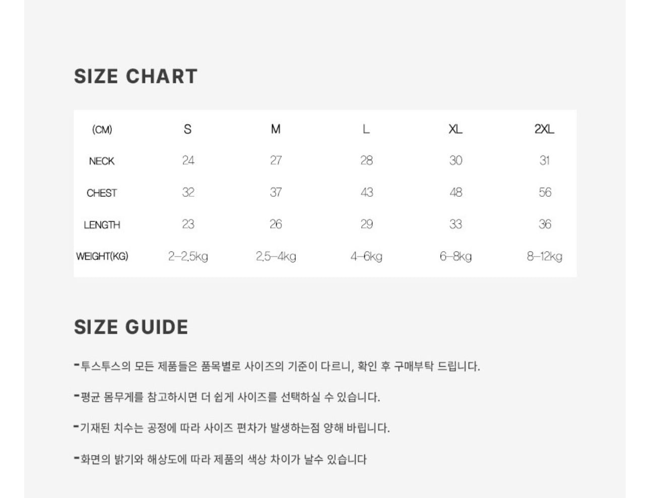 2XL:首回り31cm/胸回り56cm/背丈36cm(体重目安:8〜12kg)